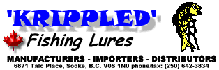 'KRIPPLED' fishing lures, are a unique line of lures developed in the salmon rich waters of British Columbia, Canada. 'KRIPPLED' lures were designed specifically for salmon and trout, and have been used with great success by thousands of local fisherman for over thirty five years! |
